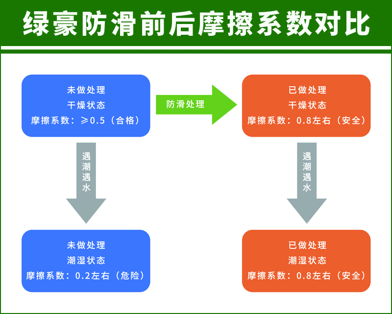 綠豪防滑劑能有效的滲入瓷磚的毛細孔內,使毛細孔變粗,在表面形成很多細小肉眼看不見的納米級凹槽,地面摩擦系數大大增加,防滑處理后表面不增加涂層,打掃衛生無影響。